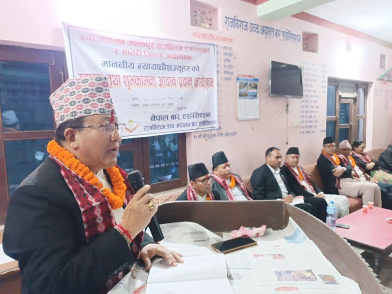 राजविराज । उच्च अदालत जनकपुर राजविराज इजलासका मुख्य न्यााधीश सुभाष पौडेल सहित नवागन्तुक उच्च तथा सप्तरी जिल्ला अदालतका न्यायाधीशहरूलाई स्वागत गरिएको छ। नेपाल उच्च अदालत बार एशोसिएसन राजविराजद्वारा दीपावली छठ पर्वको अवसरमा राजविराजमा बिहीवार आयोजित शुभकामना आदानप्रदान कार्यक्रमम..