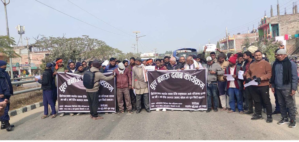 निर्माणधीन पुल स्थलबाट स्थानीय राजनीतिक दल तथा युवाले निकालेको विरोध जुलुस सखुवा महेन्द्रनगरमा जनकपुरधाम ढल्केवर सडक खण्डमा आधा घण्टा चक्काजाम गरेका छन् ।