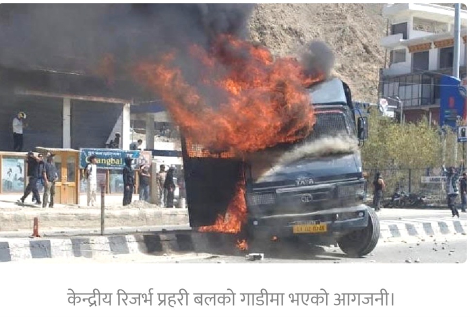 भारतको लद्दाखमा हिंसात्मक प्रदर्शन : बीजेपीको जिल्ला कार्यालय तथा सुरक्षा निकायका गाडीहरूमा तोडफोड तथा आगजनी