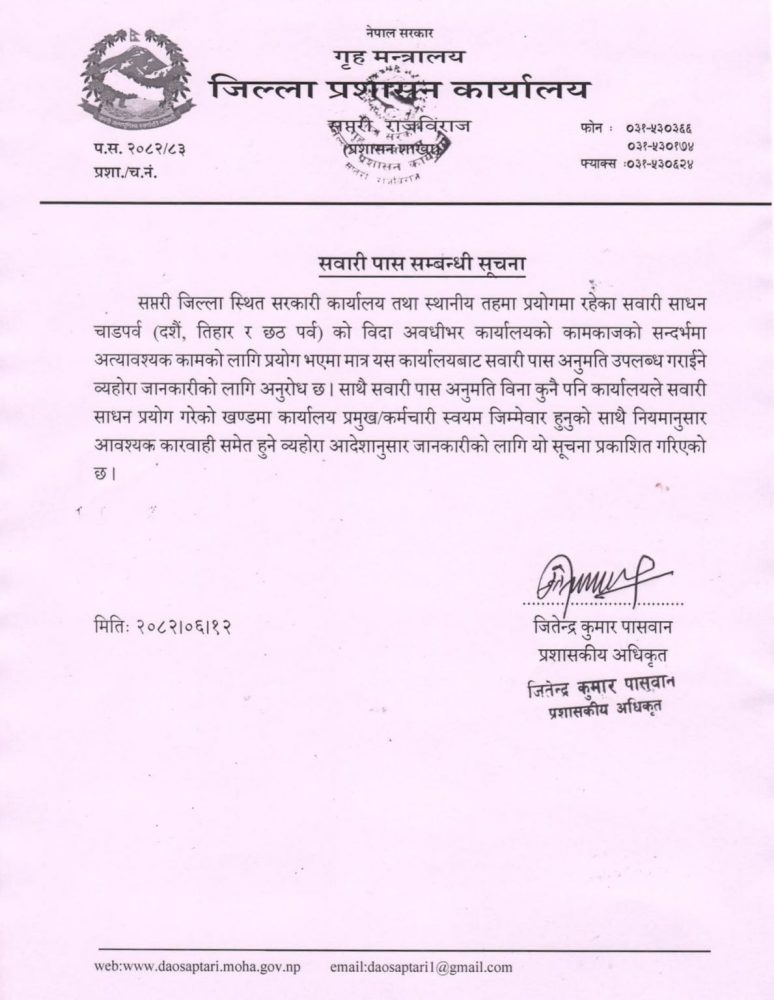 प्रशासकीय अधिकृत जितेन्द्रकुमार पासवानले जारी गरेको सूचनामा कार्यालयको अतिआवश्यक कामकाज बाहेक सरकारी गाडी प्रयोग नगर्न आग्रह गरिएको छ ।