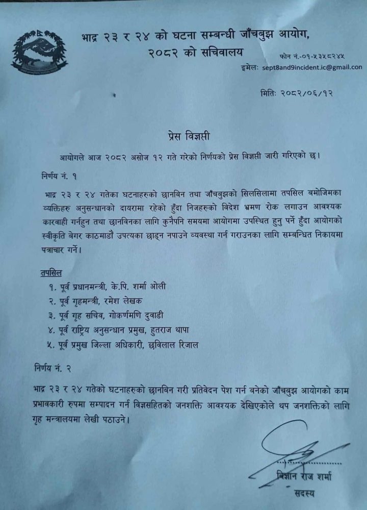 काठमाडौं । जेन–जी आन्दोलन दमनबारे जाँचबुझ गर्न गठित न्यायिक आयोगले निवर्तमान प्रधानमन्त्री केपि शर्मा ओली सहित पाँच जनालाई विदेश भ्रमणमा जान रोक लगाउन सरकारलाई सिफारिस गरेको छ ।