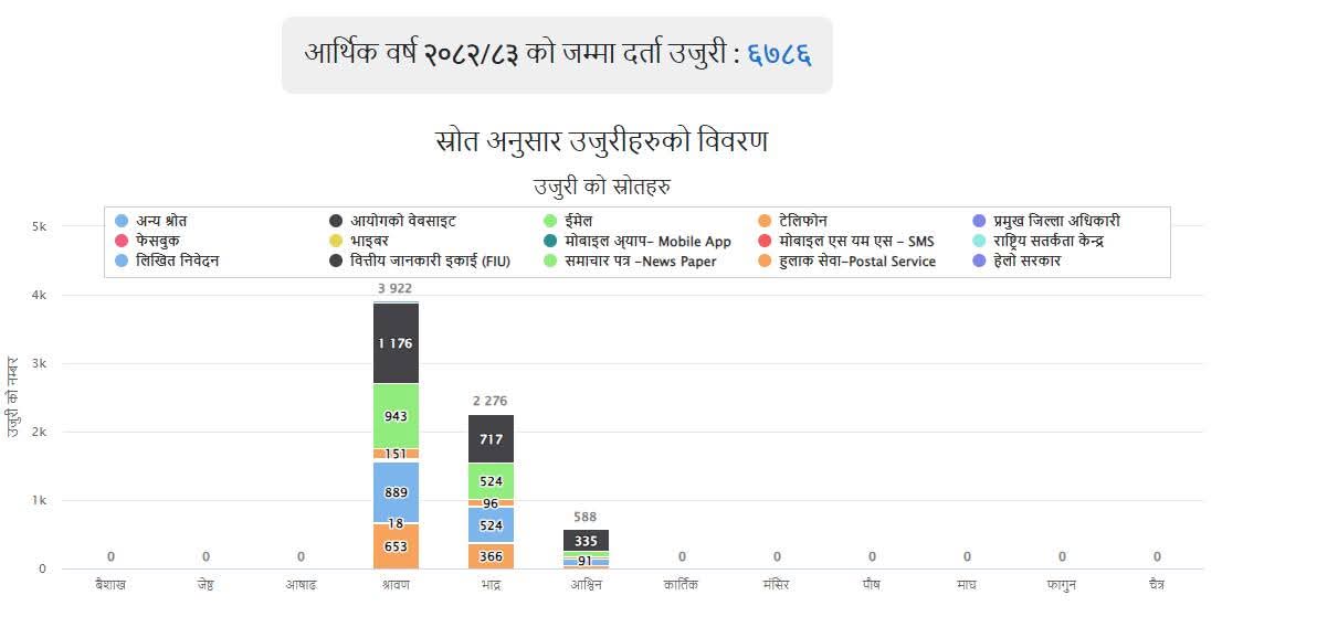 भदौ महिनामा आयोगमा २ हजार २७६ उजुरी दर्ता भएका छन् । तीमध्ये ७१७ वटा उजुरी आयोगको वेबसाइटमार्फत दर्ता भएका छन् ।सोही अवधिमा लिखित निवेदन र ईमेलमार्फत दर्ता भएका उजुरी बराबरी ५२४/५२४ छन् भने हुलाकमार्फत ३६६ वटा उजुरी दर्ता भएका छन् । यस्तै, असोज १३ गतेसम्म आयोगमा ५८८ वटा उजुरी दर्ता भएको आयोगले जनाएको छ ।