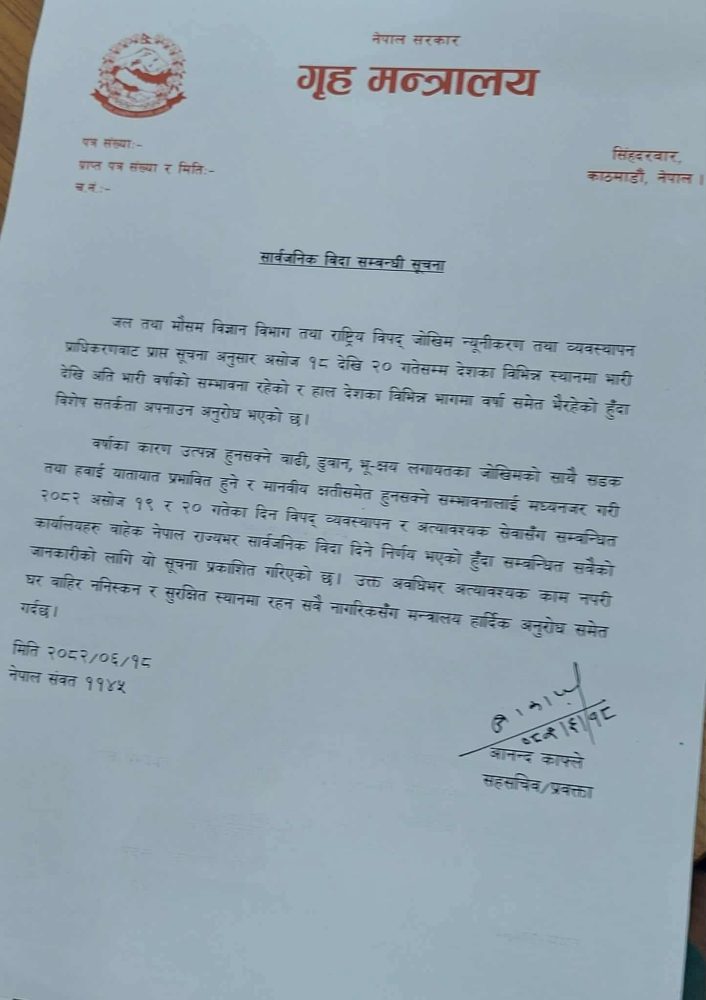 वर्षाका कारण हुनसक्ने बाढी, डुबान, भू–क्षय लगायतका जोखिम एवम् सडक तथा हवाई यातायात प्रभावित हुनसक्ने र मानवीय क्षतिसमेत हुन सक्ने भन्दै सार्वजनिक विदा दिएको मन्त्रालयले आज निकालेको सूचनामा उल्लेख छ । विपद् व्यवस्थापन र अत्यावश्यक सेवासँग सम्बन्धित कार्यालयहरु भने खुल्ला नै रहनेछ ।