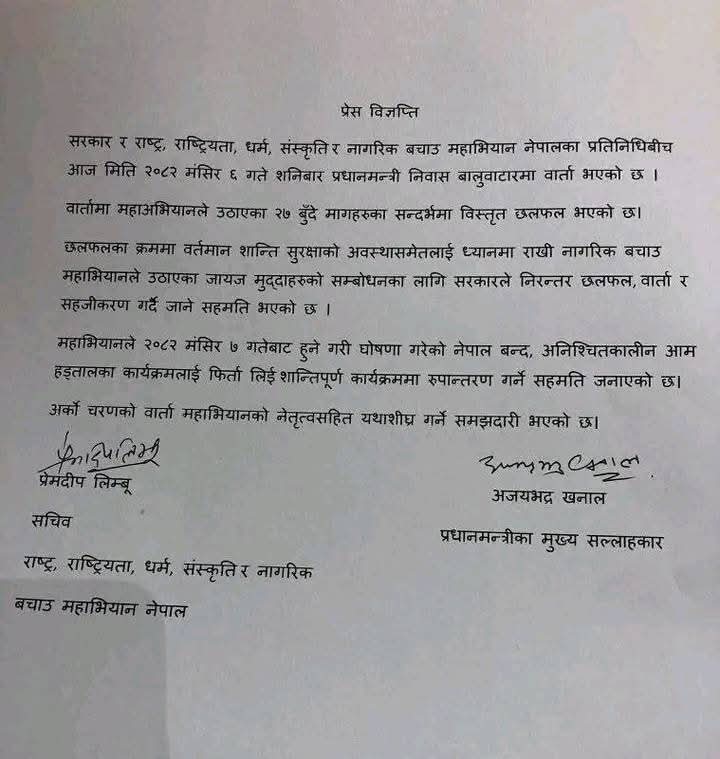 प्रधानमन्त्री निवास बालुवाटारमा हिजो भएको वार्तापछि समूहले विरोध प्रदर्शनलगायतका कार्यक्रम फिर्ता लिएको जनाएको छ । सहमतिपत्रमा प्रधानमन्त्रीका मुख्य सल्लाहकार अजयभद्र खनाल र समूहको तर्फबाट सचिव प्रेमदीप लिम्बूले हस्ताक्षर गर्नुभएको छ ।