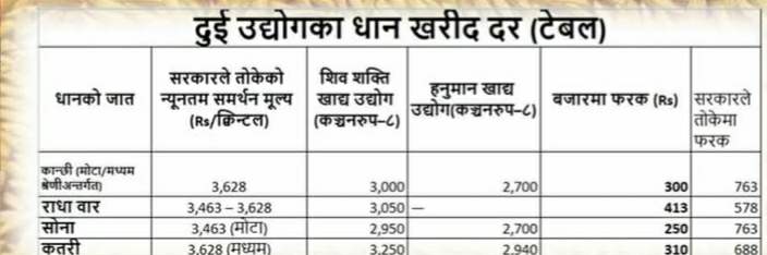 सरकारले आर्थिक वर्ष २०८२/८३ का लागि मोटा धान ३,४६३ रुपैयाँ/क्विन्टल र मध्यम धान ३,६२८ रुपैयाँ/ क्विन्टल न्यूनतम समर्थन मूल्य तय गरे पनि कञ्चनरुप–८ कंचनपुरका दुई खाद्य उद्योगले यसको पालना नगरेको प्रमाण खुलेको हो ।