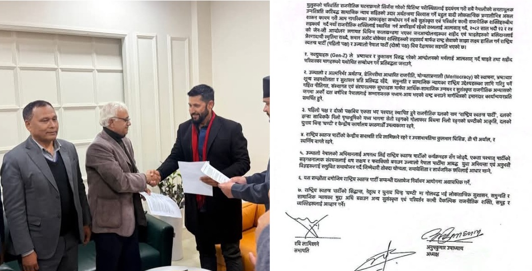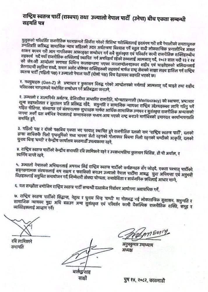 काठमाडौं । राष्ट्रिय स्वतन्त्र पार्टी-रास्वपा र ऊर्जामन्त्री कुलमान घिसिङ संरक्षक रहनुभएका उच्यालो नेपाल पार्टीबीच सहमति भएको छ ।काठमाडौँ महानगरका प्रमुख बालेन्द्र शाहलाई साक्षी राखेर दुबै पार्टीबीच एकता भएको हो । ऊर्जामन्त्री कुलमान घिसिङलाई रास्वपामा दोस्रो वरीयतासहित उपसभापति पद दिइने भएको छ । बालेन्द्र शाहलाई साक्षी राखेर कुलमानलाई सभापति रवि लामिछानेपछि दोस्रो वरीयता दिइएको हो ।
