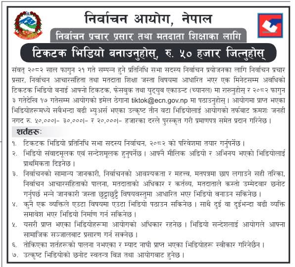 आयोगका अनुसार तयार पारिने भिडिओ एक मिनेटसम्मको हुनुपर्नेछ। त्यसरी तयार पारिएका टिकटक भिडिओ आफ्नो टिकटकसँगै फेसबुक तथा युट्युब एकाउन्टमा पनि पोस्ट गर्नुपर्ने व्यवस्था गरिएको छ।आयोगले सूचनामा उल्लेख गरेअनुसार २०८२ फागुन ३ गतेदेखि १७ गतेसम्म उक्त भिडिओ आयोगको तोकिएको इमेल ठेगानामा पठाउनुपर्नेछ।आयोगमा प्राप्त भएका भिडिओहरूमध्ये सबैभन्दा बढी भ्यूअर्स प्राप्त गर्ने उत्कृष्ट तीनवटा भिडिओलाई क्रमशः ५० हजार, ३० हजार र २० हजार रुपैयाँ नगद पुरस्कारसहित प्रमाणपत्र प्रदान गरिने आयोगले जनाएको छ।यद्यपि, भिडिओ निर्माण गर्ने क्रियटरले आयोगले तोकेका सातवटा शर्त अनिवार्य रूपमा पालना गर्नुपर्ने सूचनामा उल्लेख गरिएको छ।