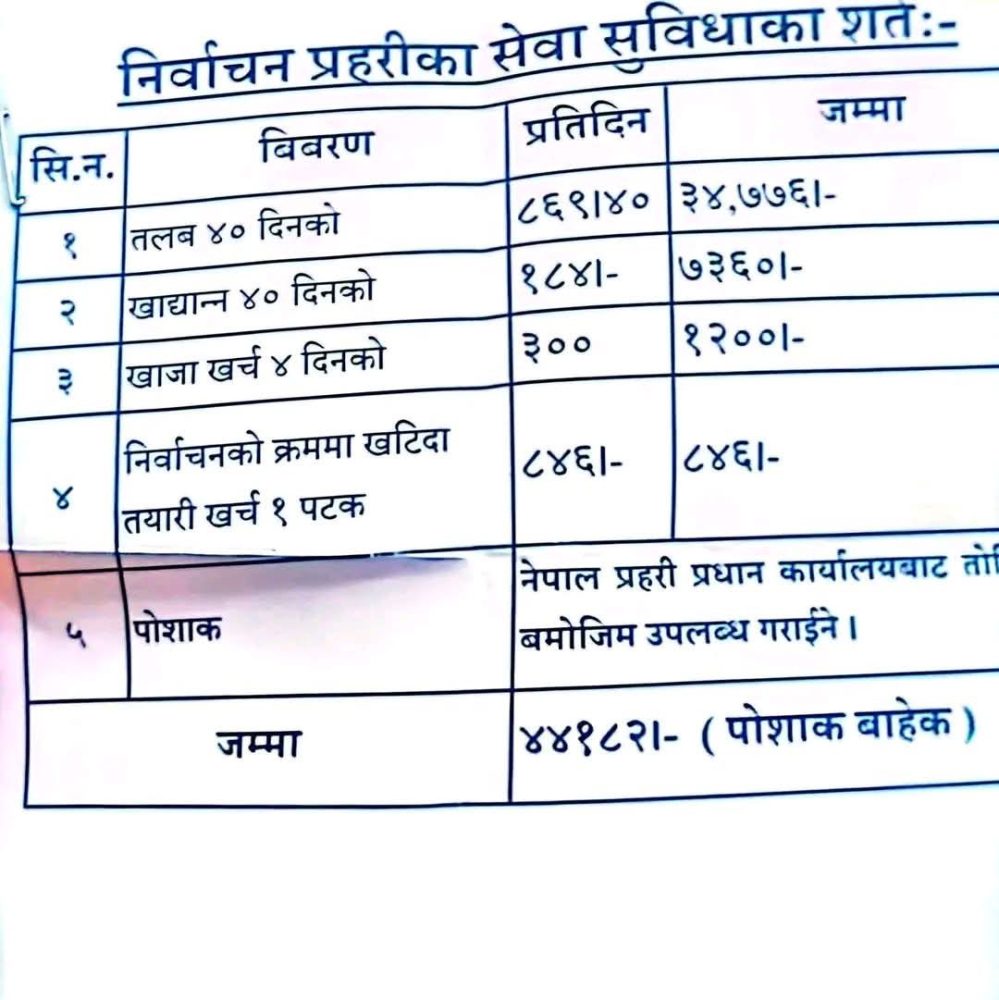 आगामी निर्वाचनका लागि खटिने नेपाल प्रहरीका सुरक्षाकर्मीलाई विशेष सेवा–सुविधा प्रदान गरिने भएको छ । सार्वजनिक गरिएको विवरणअनुसार ४० दिनको अवधिका लागि तलब, खटाइ भत्ता, खाजा खर्च तथा तयारी खर्च उपलब्ध गराइनेछ ।