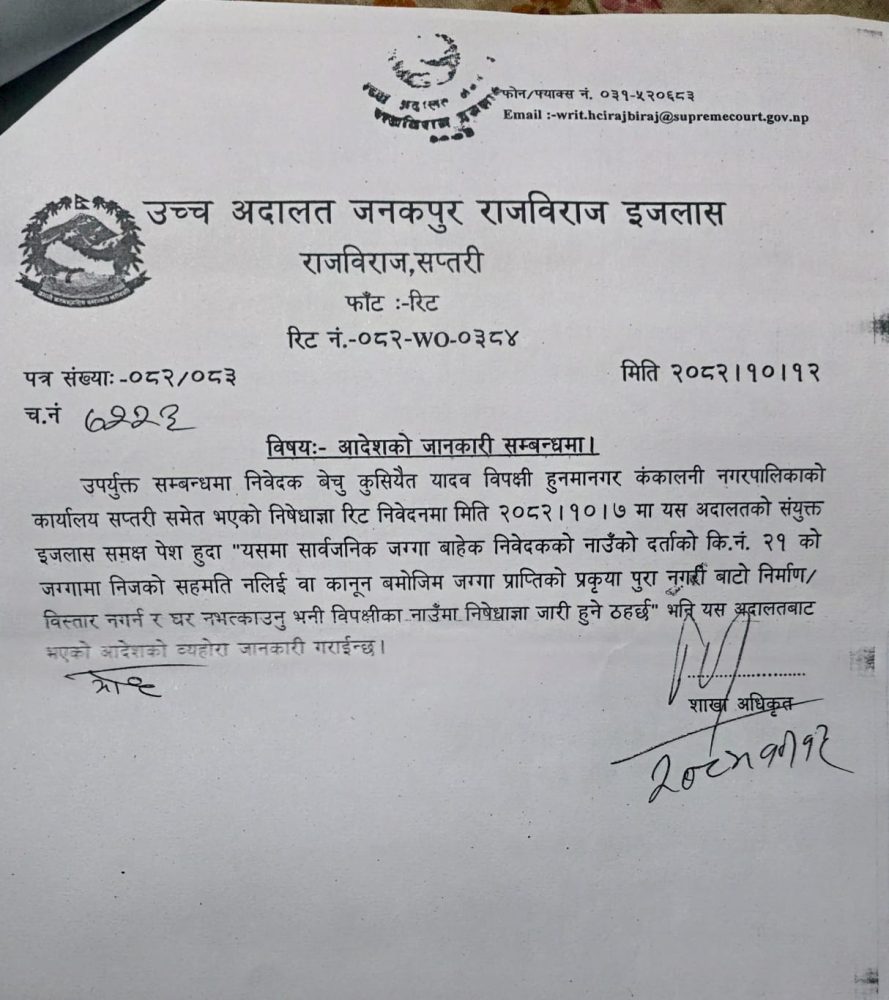 १२ माघ २०८२ मा अदालतले दिएको आदेशमा भनिएको छ, ‘जग्गाधनीको सहमति नलिइ वा कानुन बमोजिम जग्गा प्राप्तिको प्रक्रिया पूरा नगरी बाटो निर्माण /विस्तार नगर्न र घर नभत्काउनु भनी विपक्षीका नाममा निषेधाज्ञा जारी हुने ठहर्छ ।’
