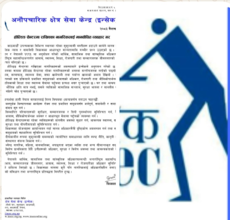 इन्सेकले नेपालले अन्तर्राष्ट्रिय स्तरमा लिएको प्रतिबद्धताअनुसार गैरभेदभाव, सम्मानजनक जीवनस्तर, आवास, स्वास्थ्य, शिक्षा र रोजगारीका अधिकार सुनिश्चित गर्नुपर्ने स्मरण गराउँदै विकासका नाममा कुनै पनि नागरिकलाई अधिकारविहीन बनाउने कार्य संविधान र अन्तर्राष्ट्रिय दायित्व विपरीत हुने चेतावनी दिएको छ।