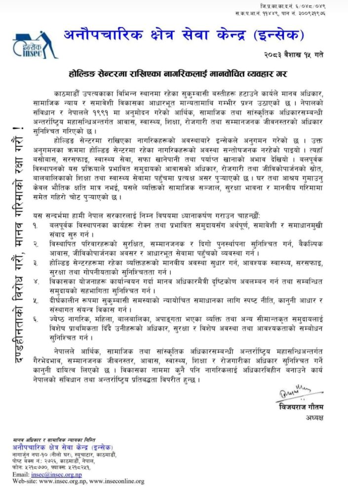 अनौपचारिक क्षेत्र सेवा केन्द्र (इन्सेक) ले काठमाडौँ उपत्यकाका विभिन्न स्थानमा रहेका सुकुम्बासी बस्तीहरू हटाउने कार्यप्रति गम्भीर चिन्ता व्यक्त गर्दै होल्डिङ सेन्टरमा राखिएका नागरिकलाई मानवोचित व्यवहार गर्न सरकारलाई आग्रह गरेको छ।
