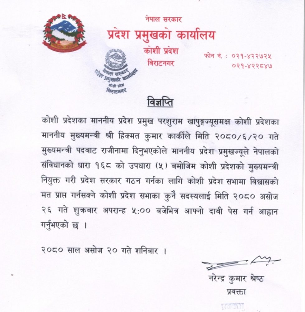 कोशी प्रदेशमा नयाँ सरकार गठनको लागि आव्हान